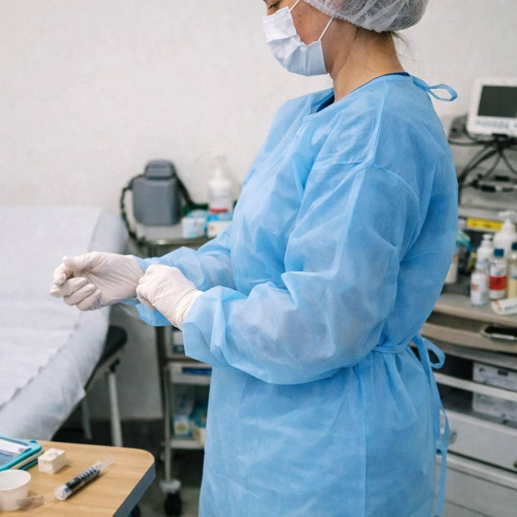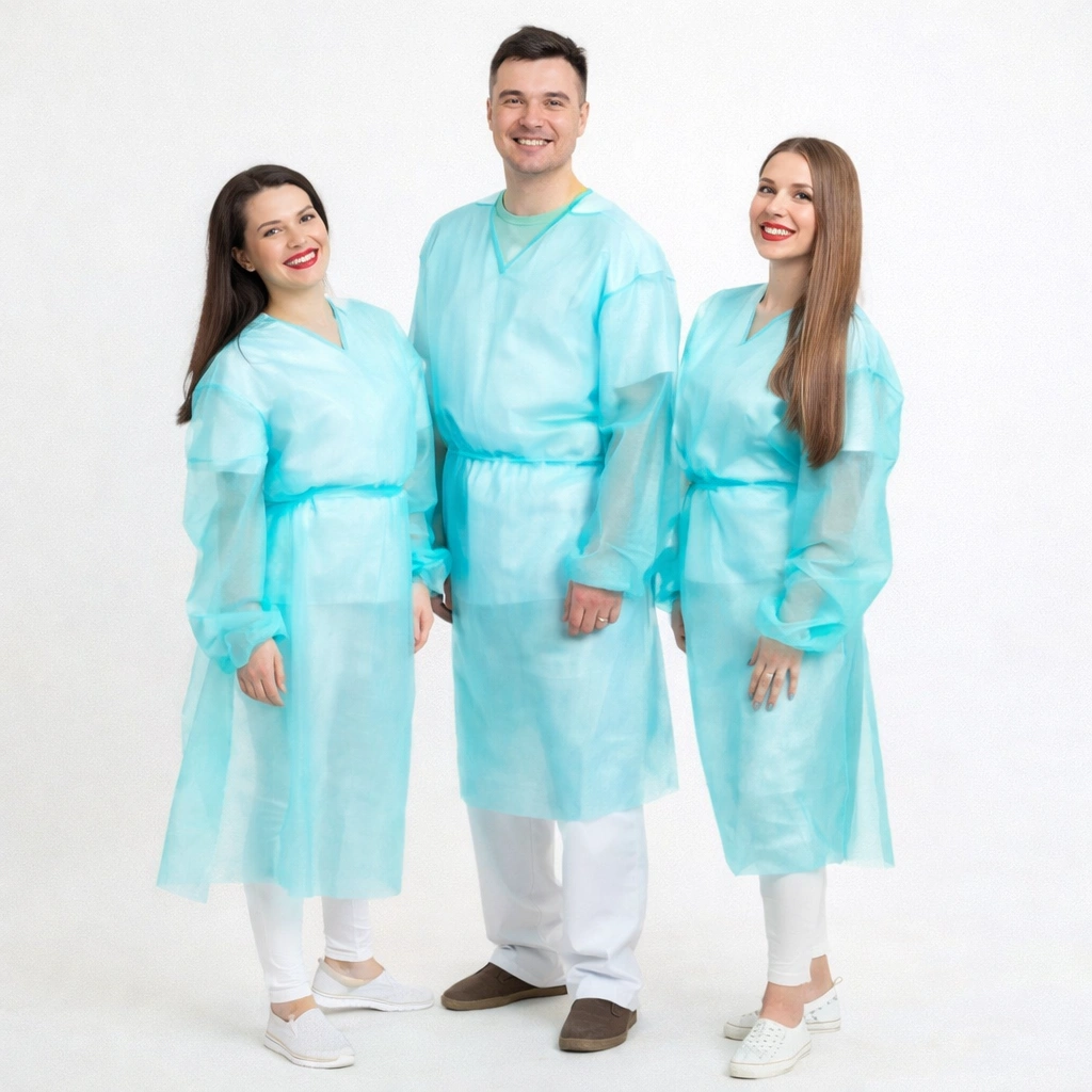 Halatele din TNT 25–40 g/m² sunt standard în spitale și clinici pentru vizitatori, personal și proceduri non-chirurgicale. Materialul este hidrofob, respirabil și ușor, oferind protecție de bază împotriva stropilor și particulelor. De obicei au închidere la spate, cordon și manșete elastice sau tricotate.