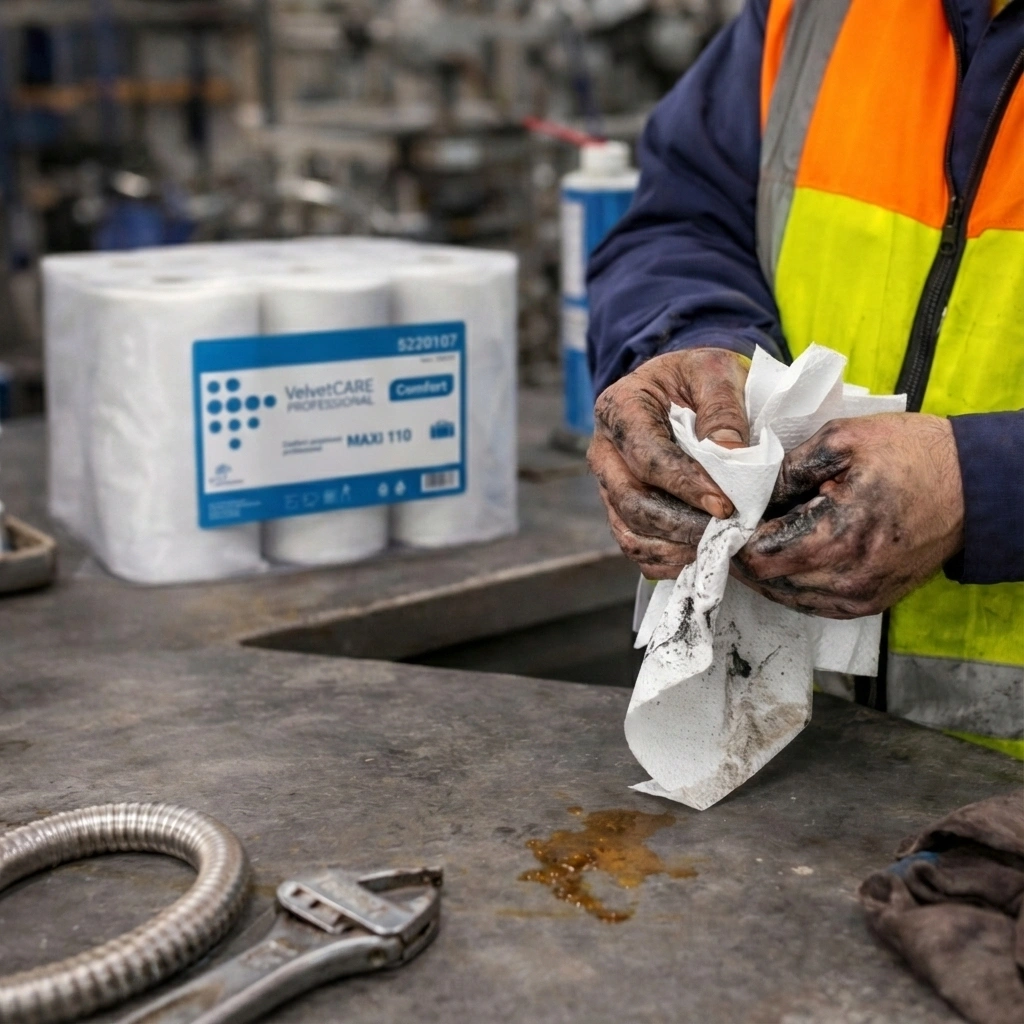 Prosoape de hârtie în rulou Velvet Care, 100% celuloză, Maxi spirale, 2 straturi, 110 m, perforații 19,2×23 cm (6 role) Prosoapele în rulou Velvet Care Maxi spirale, din 100% celuloză, sunt create pentru utilizare intensivă în bucătării profesionale, ateliere, laboratoare sau depozite. Cele 2 straturi asigură absorbție rapidă a lichidelor, uleiului și murdăriei ușoare. Rola de 110 m, cu perforații de 19,2×23 cm, permite doze egale și controlul consumului. Setul de 6 role este ideal pentru contracte HoReCa sau companii de curățenie. Celuloza pură oferă rezistență bună la frecare, fără a lăsa scame excesive pe suprafețe.