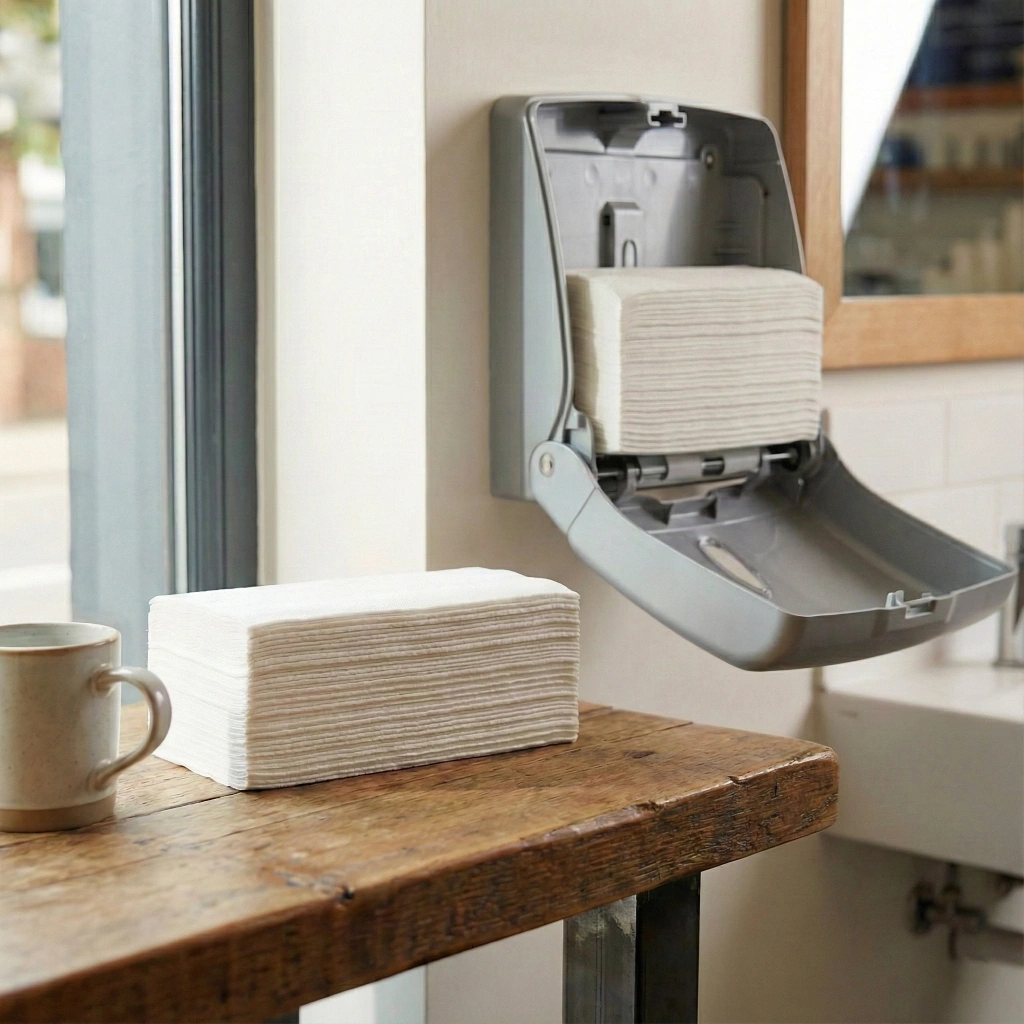 Dimensiunea de 21×23 cm este ușor mai compactă decât formatul “clasic” de 23×25 cm întâlnit la multe prosoape V-fold profesionale, dar păstrează suficientă suprafață pentru a usca mâinile cu 1–2 foi. Structura în 2 straturi oferă o absorbție bună și o rezistență adecvată la rupere în utilizare normală.