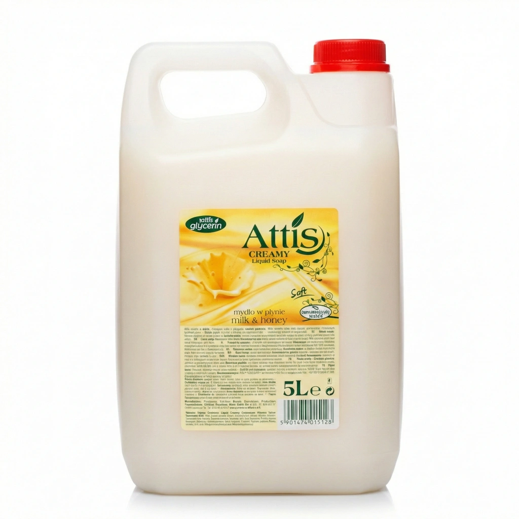 Săpun lichid cremă Attis 5 L – lapte & miere, antibacterial (Polonia) Săpun cremă Attis, cu parfum de lapte și miere, formulă blândă pentru spălat frecvent mâinile.