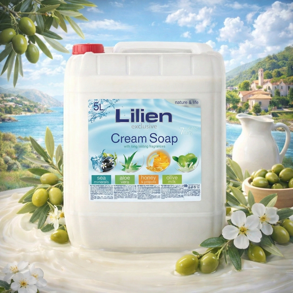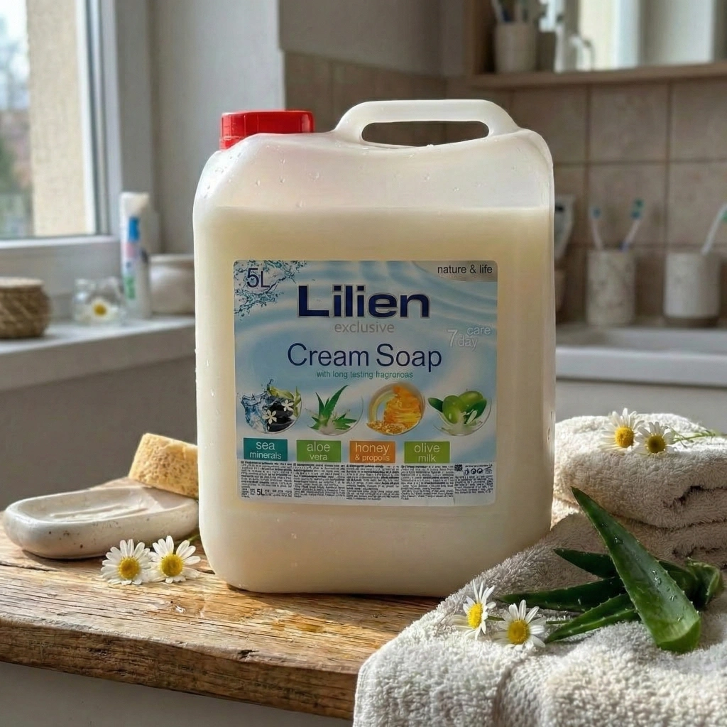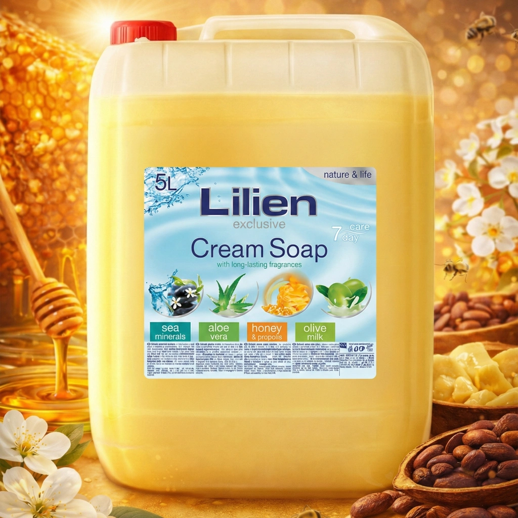 Lilien este un brand ceh specializat în produse pentru îngrijirea mâinilor și corpului. Săpunurile lichide cremă Lilien includ, de obicei, ingrediente precum glicerină, extracte naturale (aloe, miere, minerale marine) și sunt formulate fără parabeni, SLS sau uleiuri minerale în multe dintre game. Bidonul de 5 L este destinat reumplerii dozatoarelor în spații cu trafic intens: HoReCa, instituții, clinici.