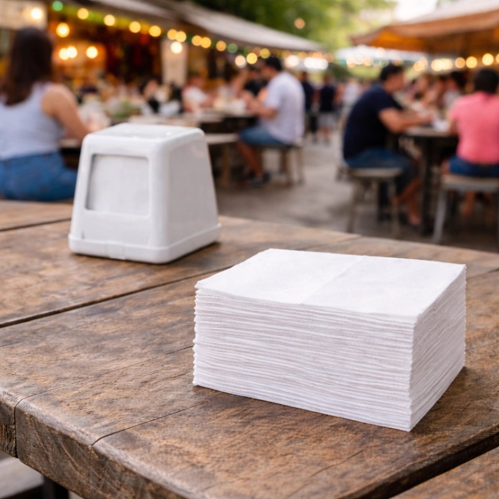 Șervețelele pentru dispenser sunt pliate astfel încât să fie dozate economic – clientul trage o singură șervețel, iar următorul rămâne pregătit. Dimensiunile 17×17 sau 19×19 cm sunt standard pentru dispenserele tabletop folosite în self-service și unități de tip fast-food.