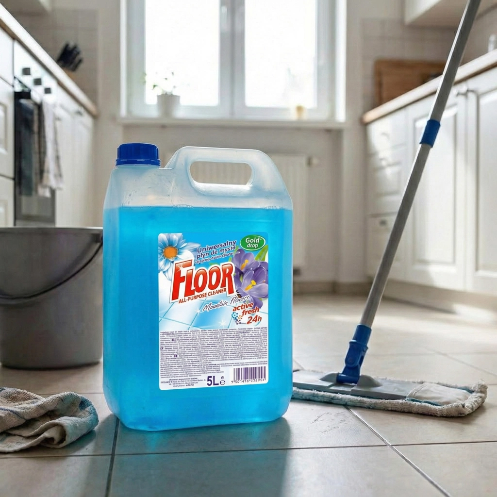 Soluția Floor lichid universal este gândită ca produs „all-in-one” pentru pardoseli, gresie, faianță și alte suprafețe lavabile. Formula sa îndepărtează murdăria zilnică și lasă în urmă un miros proaspăt, fără a necesita clătire în concentrațiile recomandate. Producția în Polonia sugerează apartenența la o gamă de detergenți de marcă (de exemplu Gold Drop / Floor).
